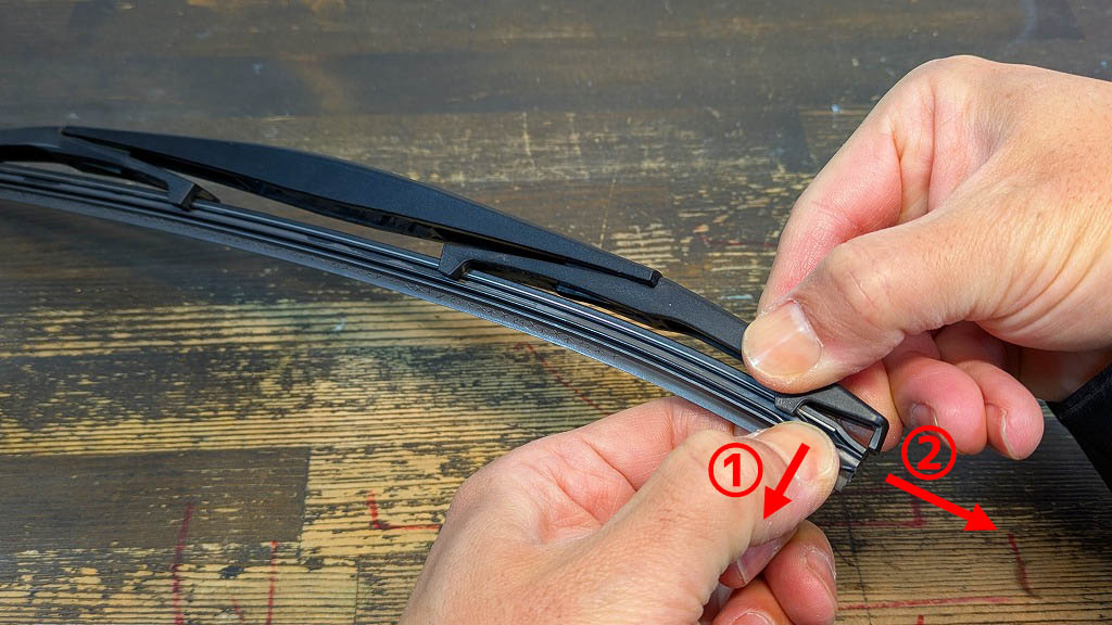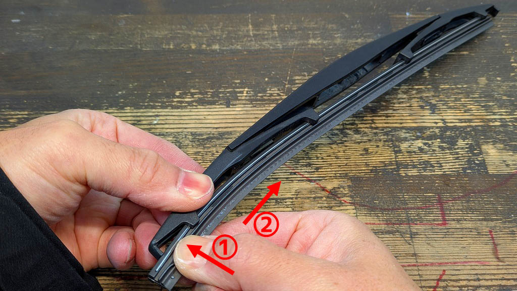 ゴムの端を①方向に引っ張り、ワイパーブレード端部ストッパーから外し、②スライドさせて丁寧に引き抜きます。