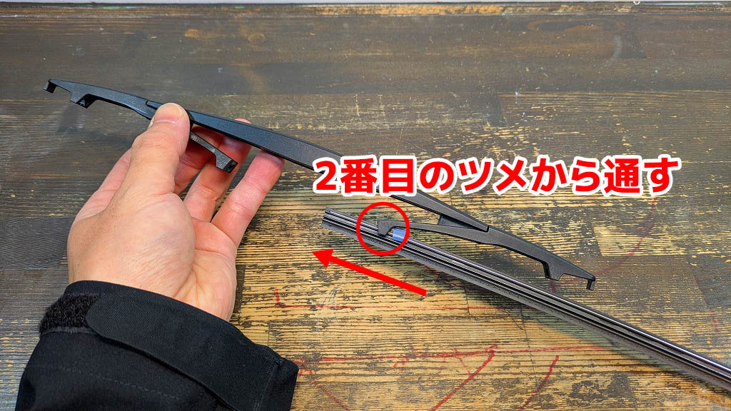 新しいワイパーゴムをワイパーブレードの2番目から通して、奥まで通していきます。